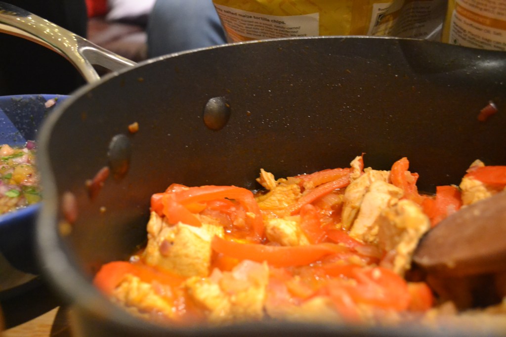 - Add the chicken breast, red onions, red peppers and red chillies to the bowl of spices and mix all together.