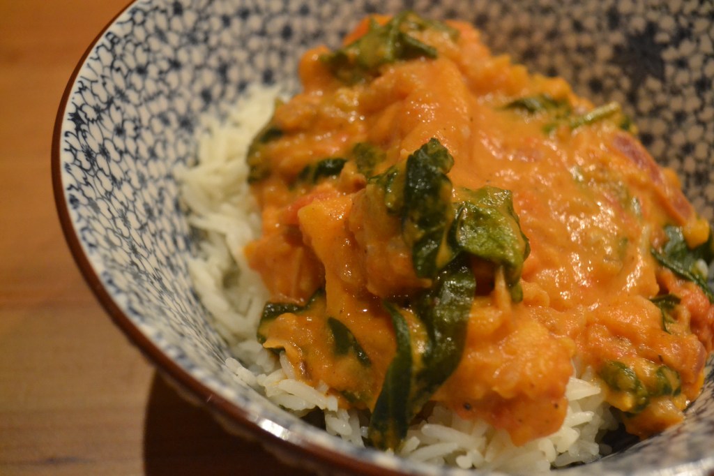 - Add sweet potato, chopped tomatoes and 300ml of stock and bring to simmer. Cook until the sweet potatoes are soft (around 20 minutes).
